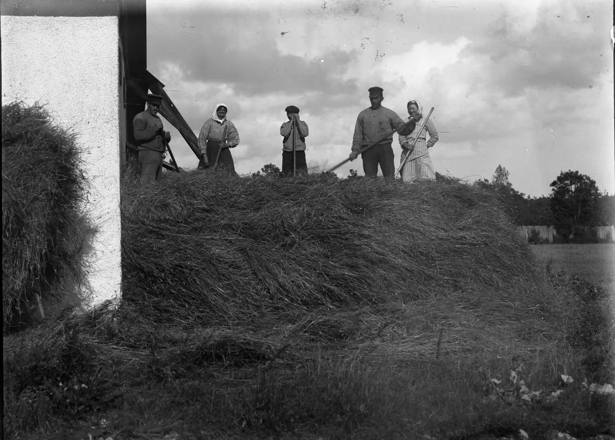 Ibland blev skörden så stor, att allt hö eller halm inte fick plats under tak. Då la man stackar utomhus, i regel runda och toppiga. Här lägger man en stack mot ladugårdsväggen, vilket inte verkar särskilt praktiskt med tanke på allt regnvatten som måste komma ner från taket!