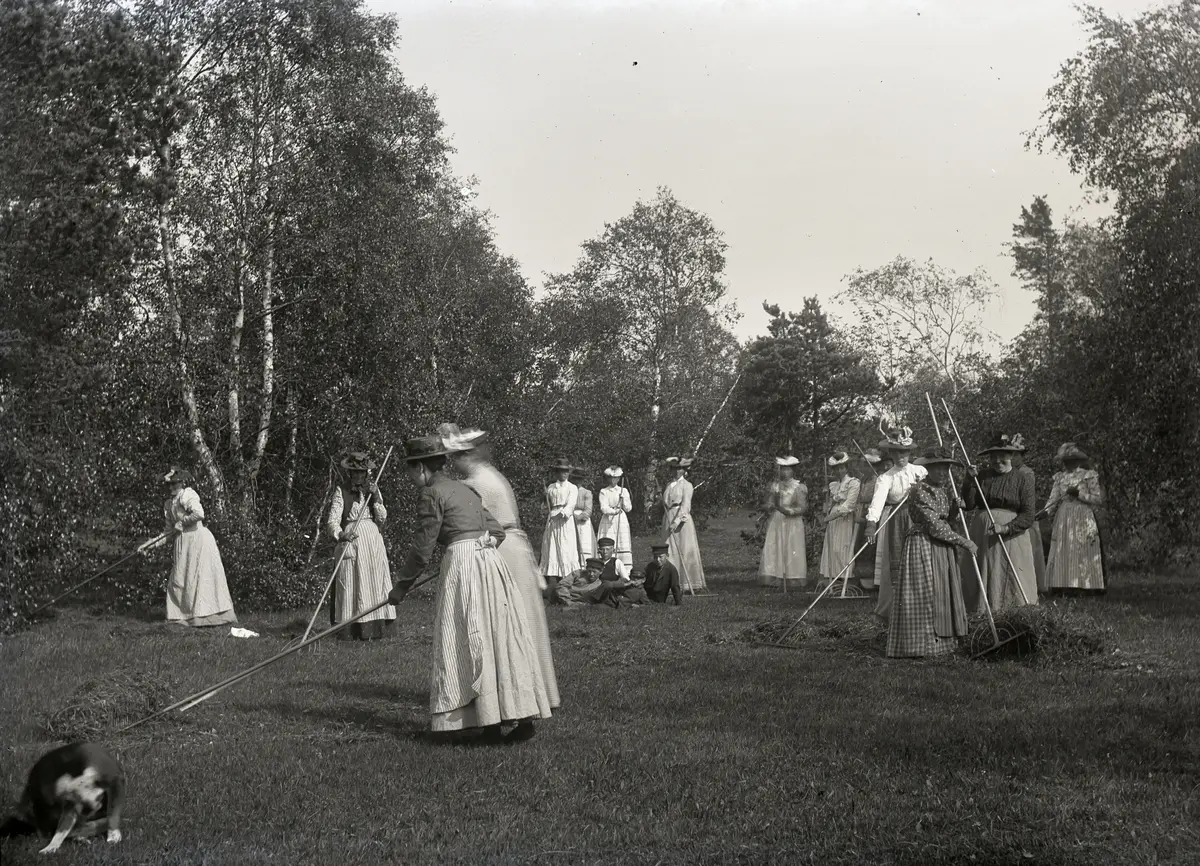 De två kvinnorna längst t v räkar rumpu, räfsar ut höet från kanterna. De två intill skjuter ihop höet till en famn. Kvinnorna t h har burit fram höet till en öppen plats i änget och börjat lägga ett braide. Det är festligt arbete och man är finklädda.