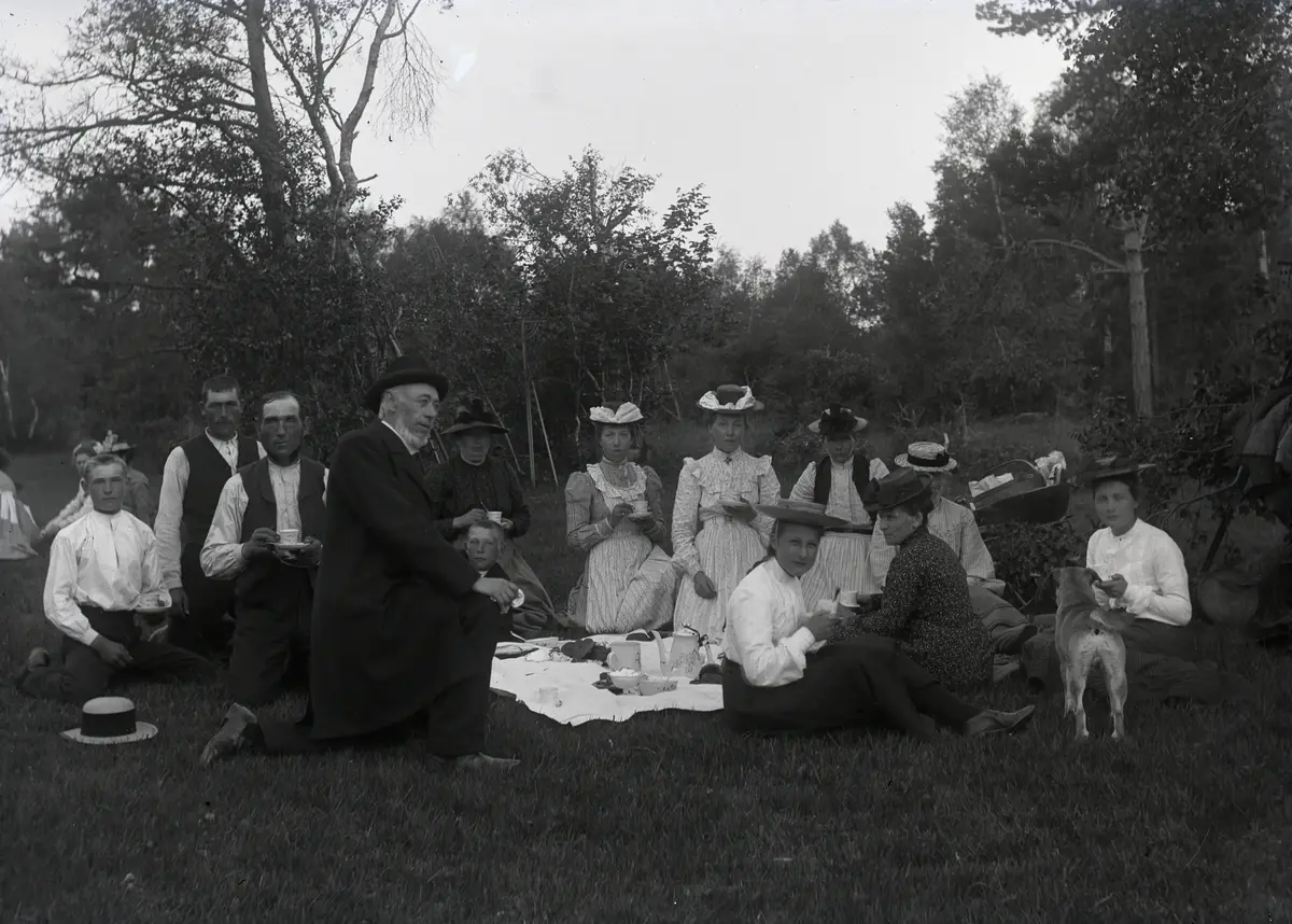 För att markera högtidligheten i den sista slåttern i Tranänget kom prosten Kahlström på besök till otendagskaffet. Här är det troligen bara Fie-familjen. JO Larsson sitter alldeles bakom prostens rygg.