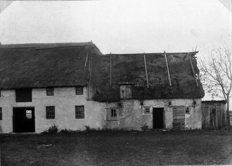 Per Olsson använde den gamla ladugårdens framvägg vid nybygget, men gjorde en ny bakvägg iom att den nya ladugården skulle få en större bredd. Dessutom byggdes ett foderloft i sten. Här har man provisoriskt fogat ihop den nya och gamla delen i väntan på att bygga vidare. Det kom dock att ta tid, inte förrän omkring 1950-talets mitt fullföljdes det planerade ladugårdsbygget. Den gamla ladugårdsdelen innehöll ett fähus med hoimd och på gaveln troligen ett lamm- eller grishus. T h står ett enkelt dass.