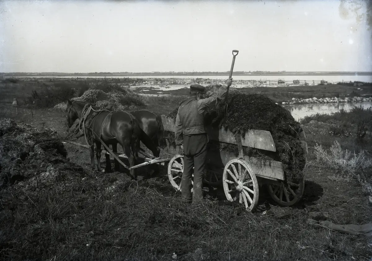 Nu får Jakå inte på mer släke och lasset är säkerligen tungt nog för hästarna. Han sätter grepen i lasset och skall köra hem. Uppskattningsvis hann han köra två sådana här lass per dag, kanske tre om han tog ett kvällspass.