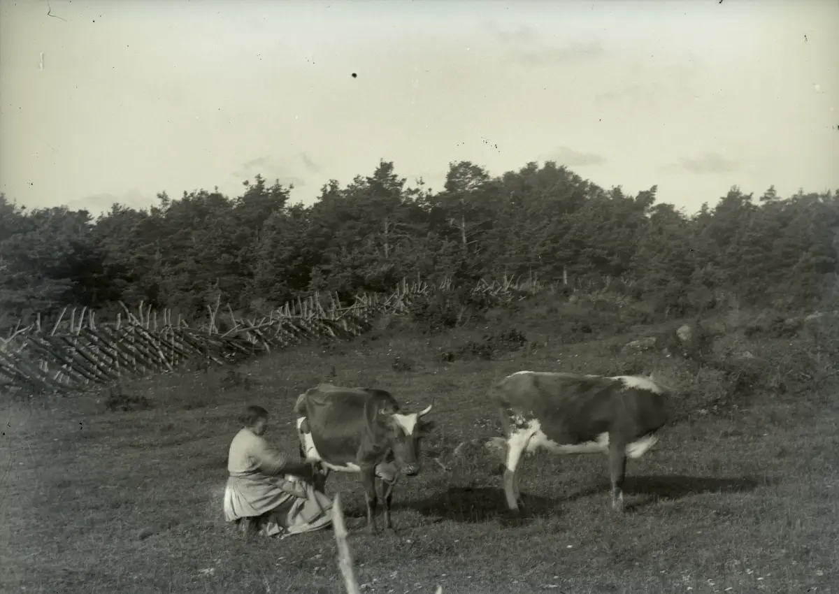 Hallute Britta på När sitter i hagen och mjölkar. Mjölkning ansågs som ett kvinnoarbete. Så här har det nog sett ut i tusentals år, bara kvinnornas klädedräkt har växlat.