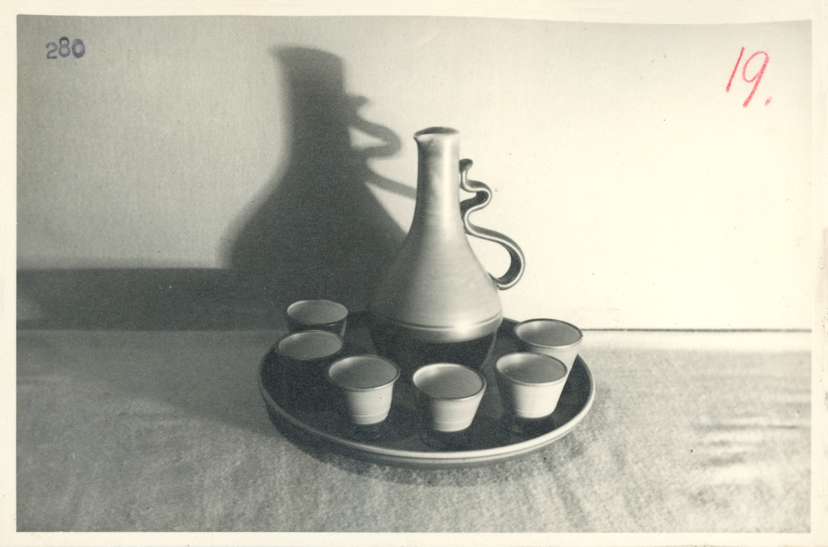 Likörkrusset med krus, bägare och bricka från Bo Fajans, formgivare Allan Ebeling, 1900-talets mitt.