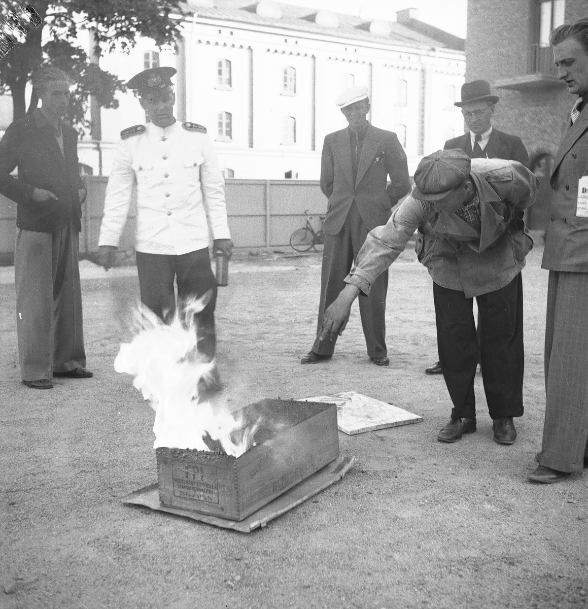 Golva AB, Malmö. Brandtest av securit-plattan. Reportage för Gefle Dagblad