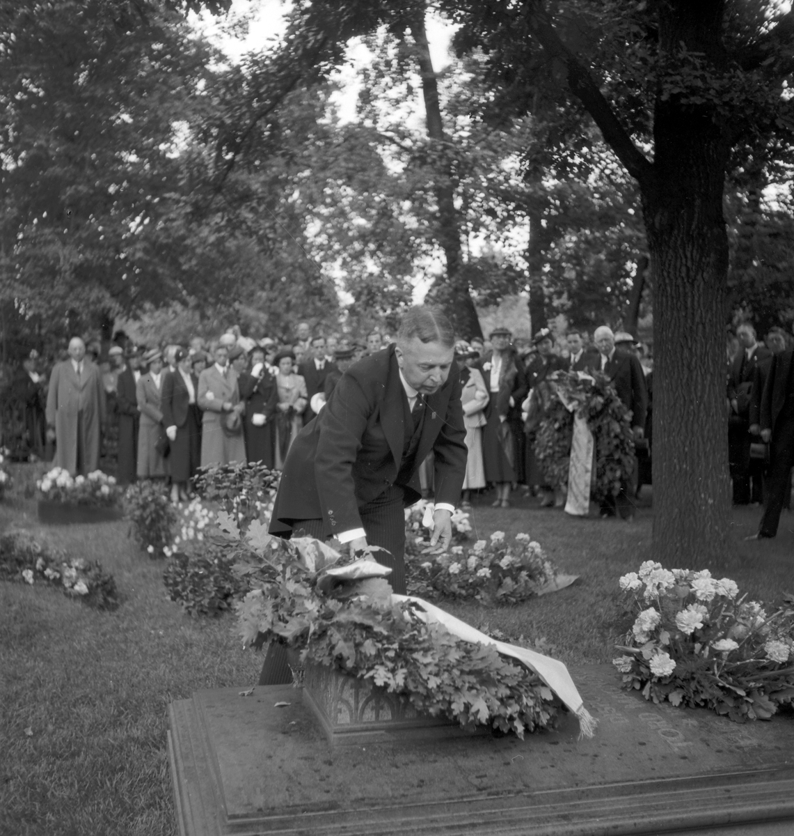 Disponent Karl Fredrik Göransson lägger en krans på sin företrädare och släkting Tord Magnusons grav. Sandviken. 75 - årsjubileum. Juli 1937.