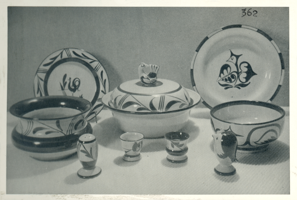 Påskservis i gulglasyr med inslag av växter och tuppar från Bo Fajans, formgivare Allan Ebeling, tidigt 1900-tal.