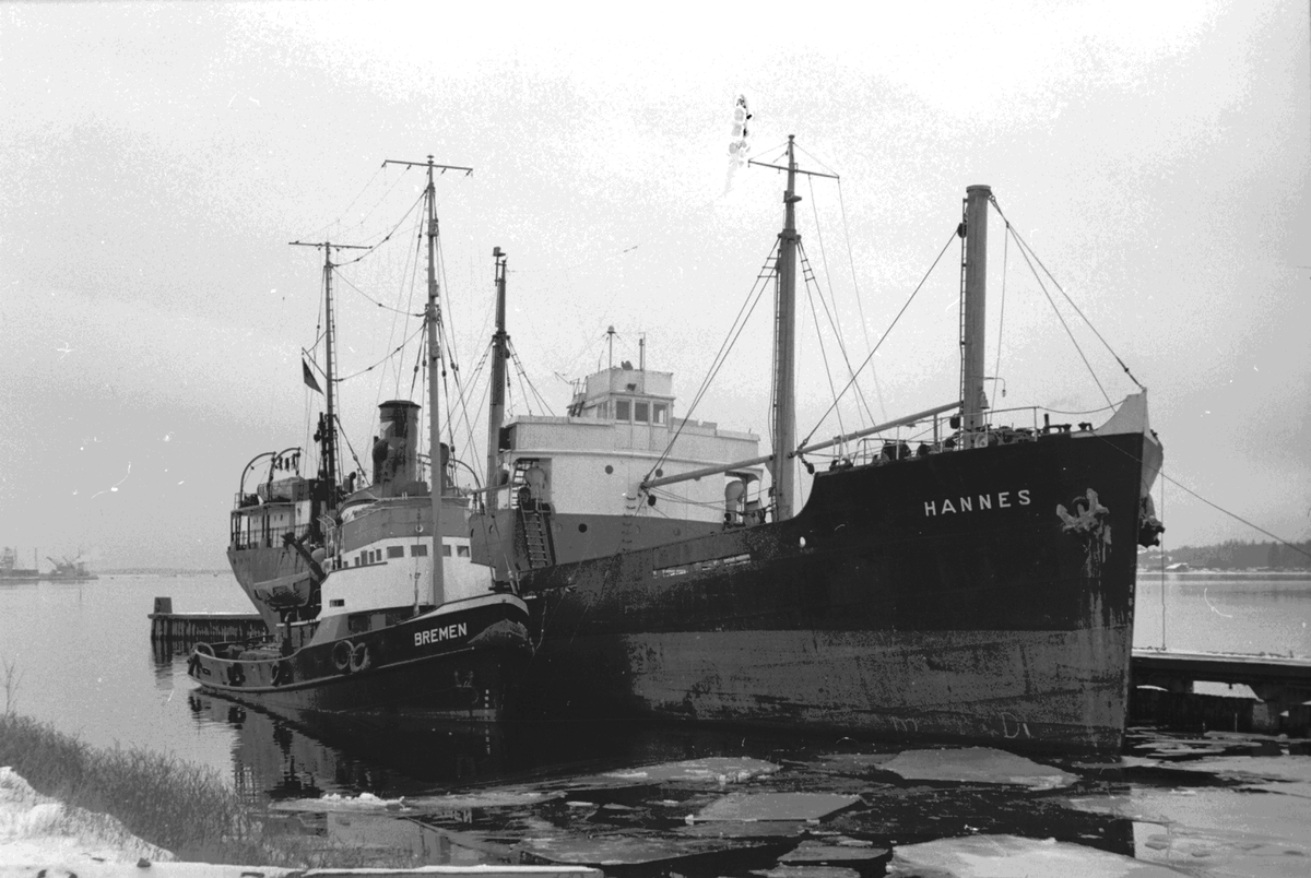 Fartyget "Hannes" bogseras från Gävle Varv hela vägen till Holland. Maskinerna är i obrukbart skick. 12 november 1952.