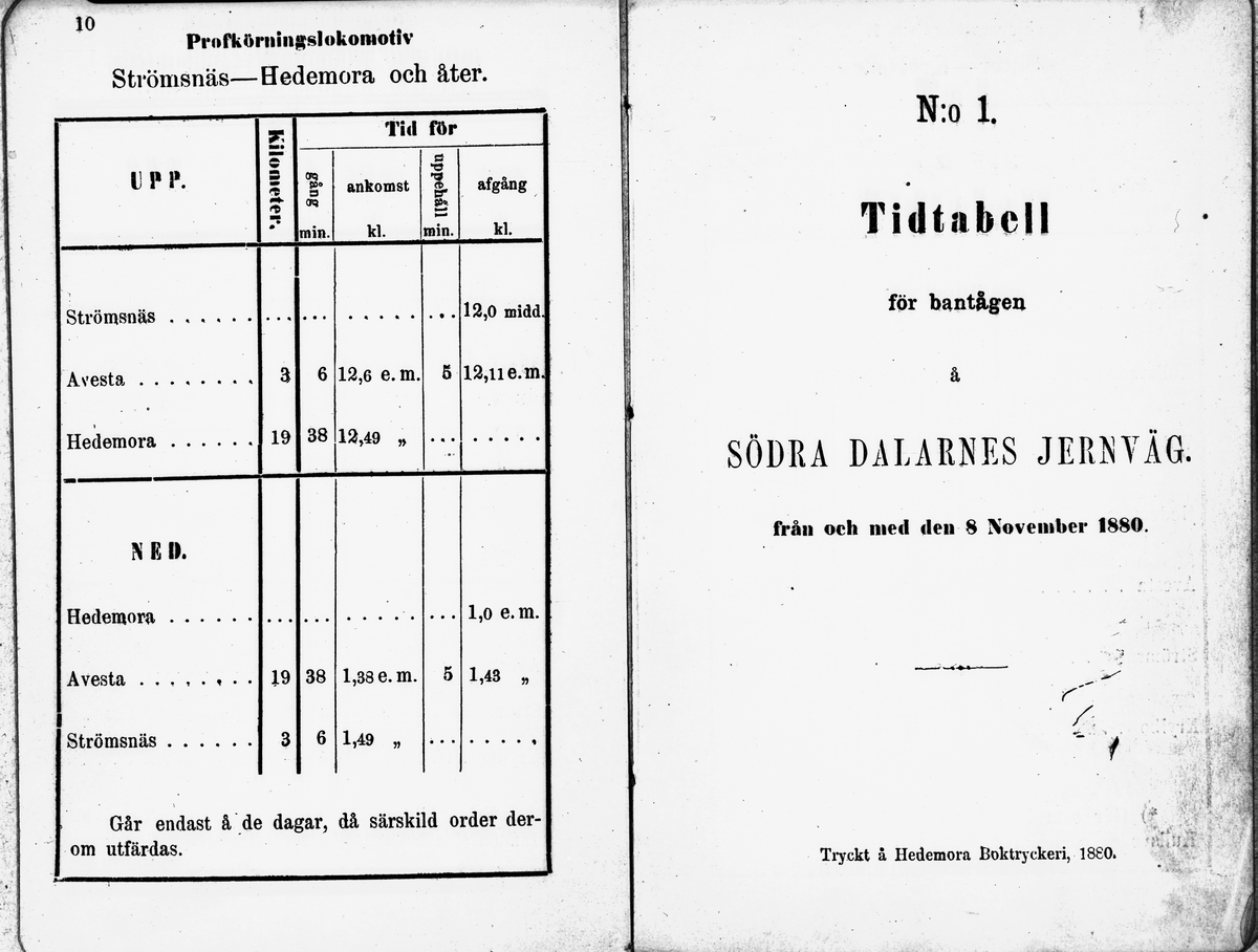 Tidtabell,för bantågen på Södra Dalarnes Jernväg. Från och med den 8 November 1880. Tryckt å Hedemora Boktryckeri 1880.
