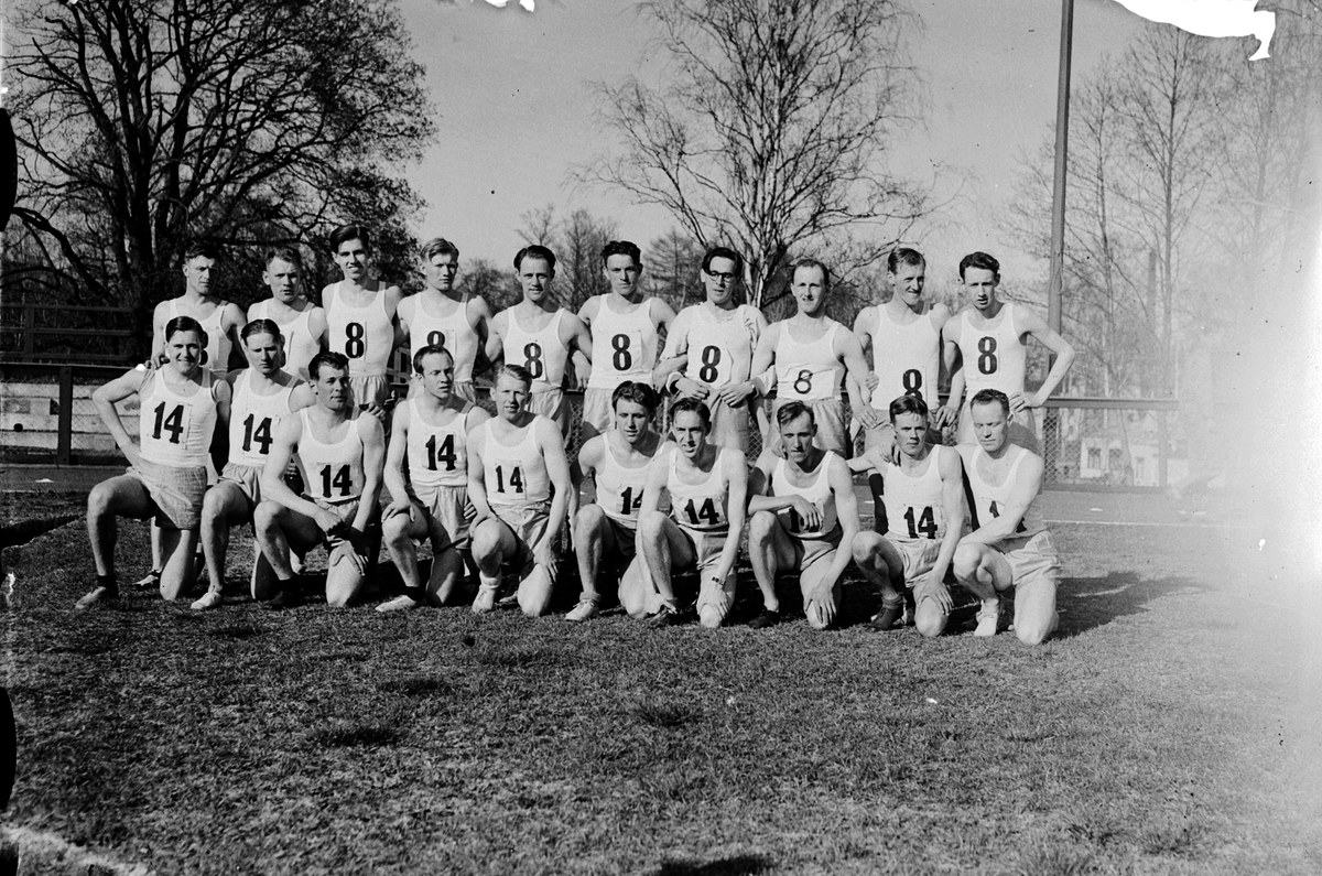 Stadslöpningen. Två segrande GIF-lag. 1939. Överst lag I med från vänster: Rune Bergman, Olle Olsson, Ale Thalén, Erland Asplund, Rune Olsson, Bertil Larsson, Torkel Lundkvist, Arne Bergqvist, Erik Arwidsson och Gösta Wernmark. Knästående lag II: Lennart Fredén, Olle Olsson, Ivar Tröjbom, Ingemar Eklund, Arne Karlsson, Erik Eriksson, Sture Öijving, Uno Thunberg, Olle Forsman och Nore Johansson. Reportage för Gefle Dagblad