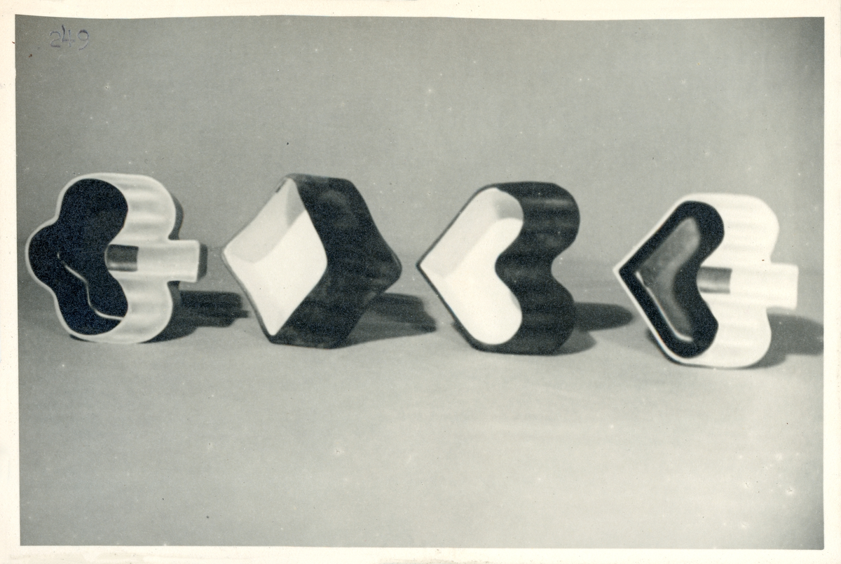 Askkoppar i form av de fyra kortleksfärgerna/svitmärkerna; klöver, ruter, hjärter och spader; från Bo Fajans, formgivare Ewald Dahlskog, 1900-talets mitt.