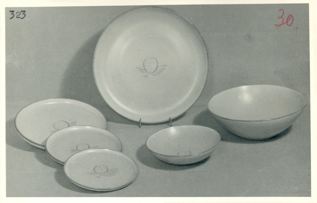 Fat, assietter och skålar i dekor Turk F från Bo Fajans, formgivare Eva Jancke-Björk, 1900-talets mitt.