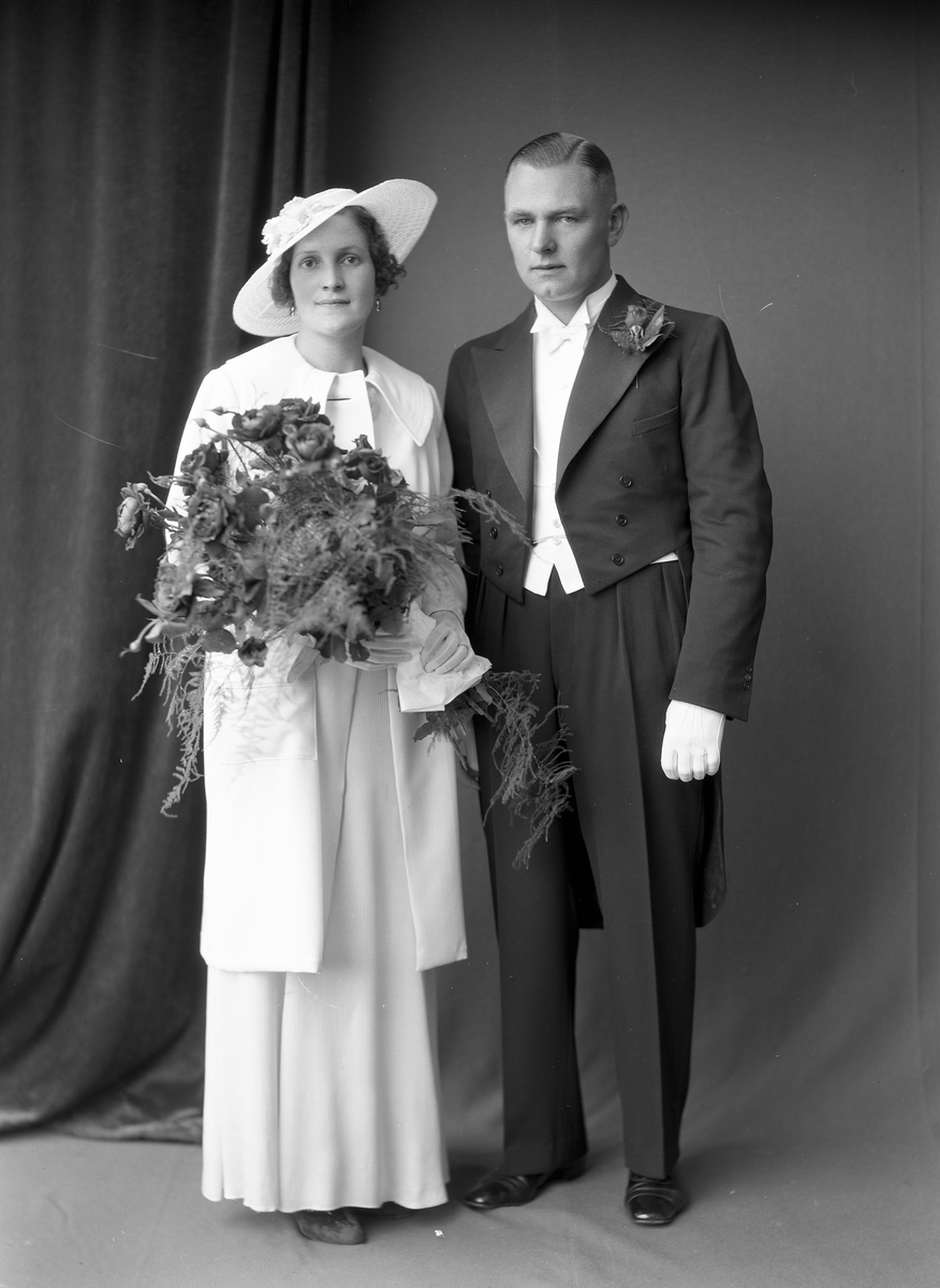 Brudparet Sterley, c/o Björk, Södra Kungsgatan 13, Gävle. Den 10 augusti 1935.