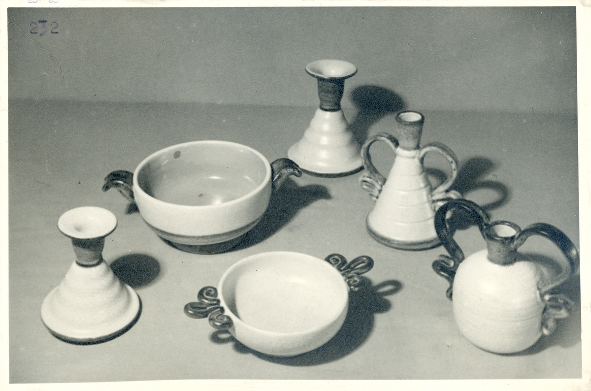 Ljusstakar och skålar från Bo Fajans, formgivna av Eva Jancke-Björk samt Alan Ebeling, 1900-talets mitt.