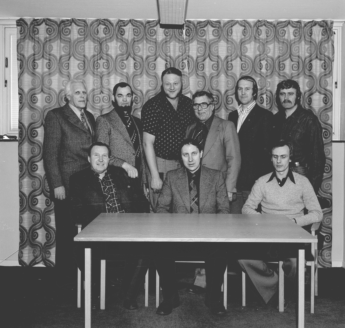 Nio okända män vid ett bord.