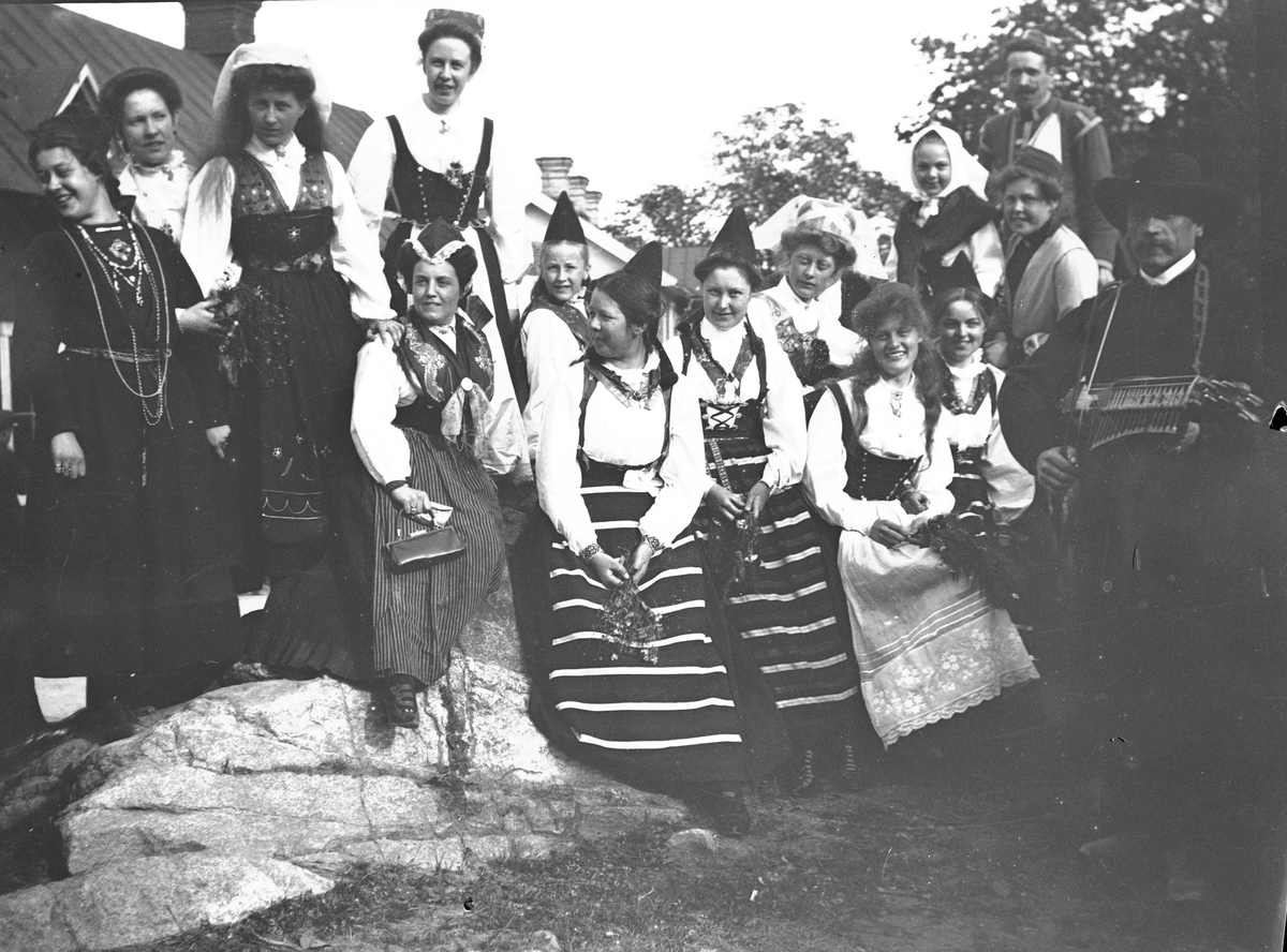 Furuvik. Män och kvinnor i folkdräkter och en som spelar nyckelharpa