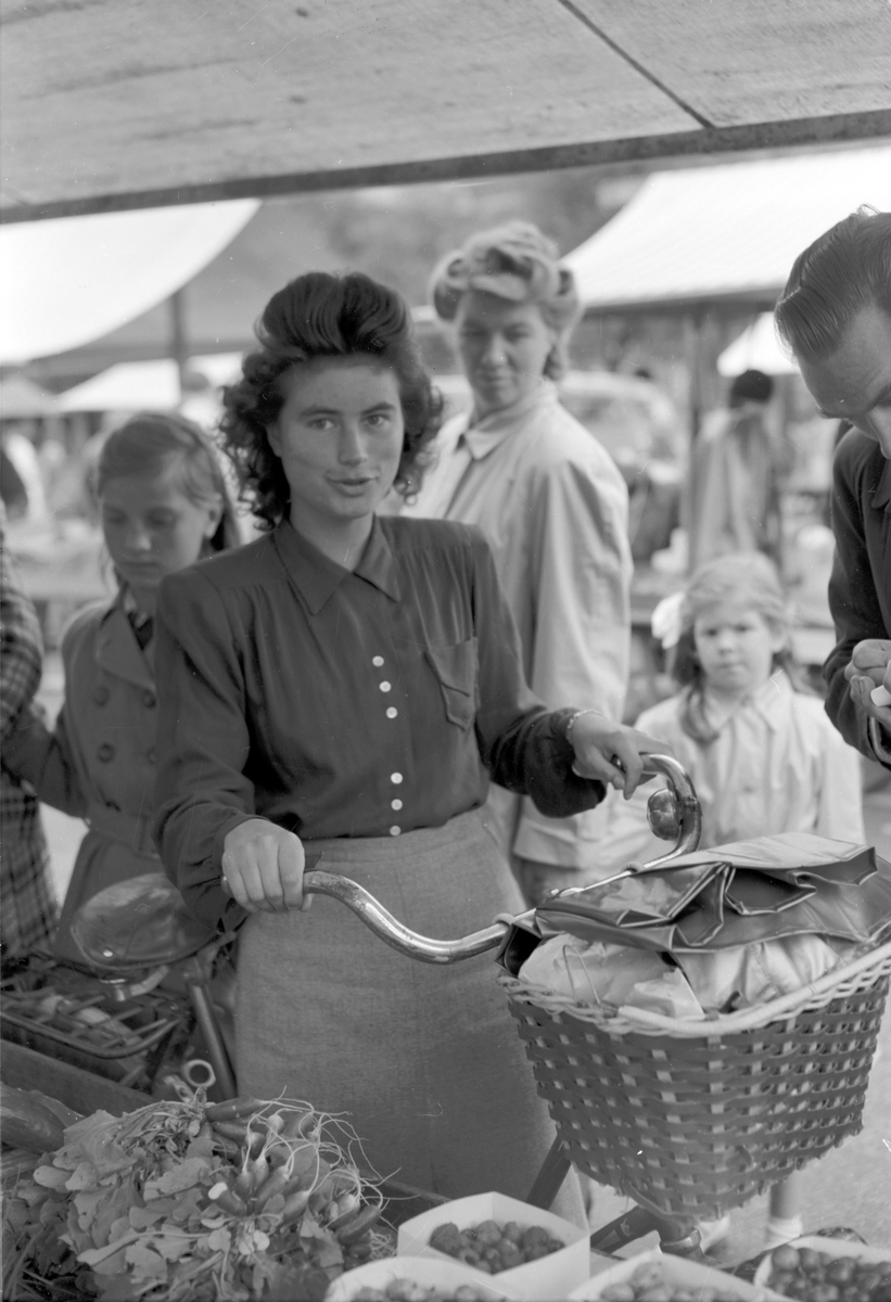 Bärreportage "Kvinna med cykel" på Stortorget. Den 25 juli 1949