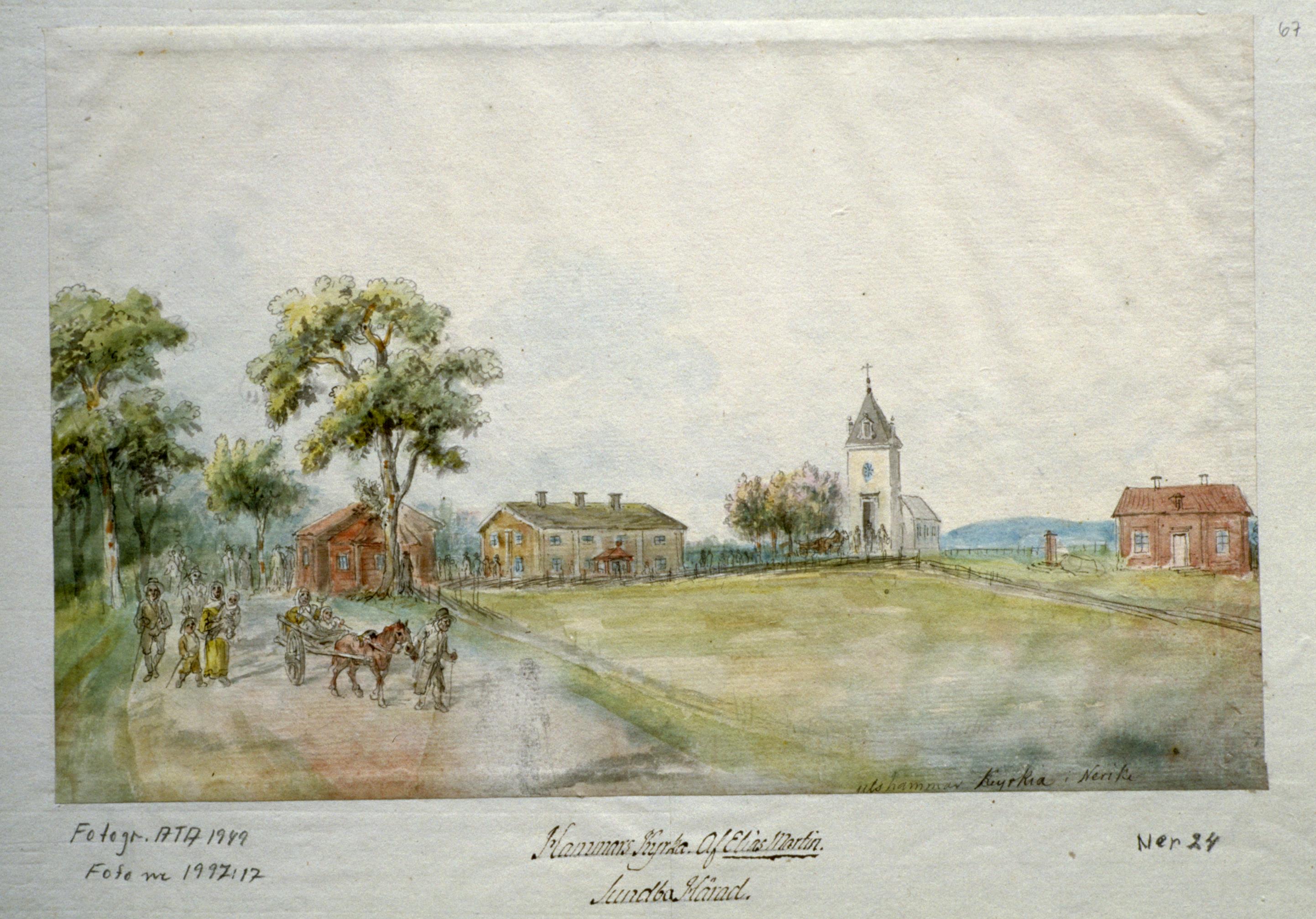 Vid Hammars kyrka. Akvarellerad pennteckning av Elias Martin från 1780-90-talet.