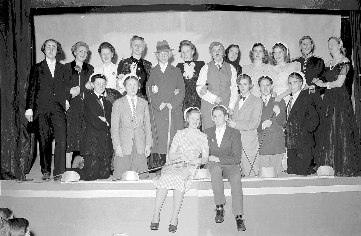 Kommunala flickskolan. Längst t v (i herrkostym) Ingrid Fors och i officersuniform närst längst till höger Astrid Ahrne.