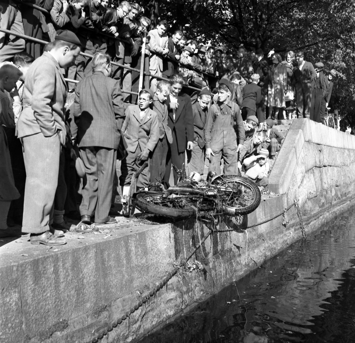 Motorcyklist tappar cykeln i Gavleån. 14 september 1952.