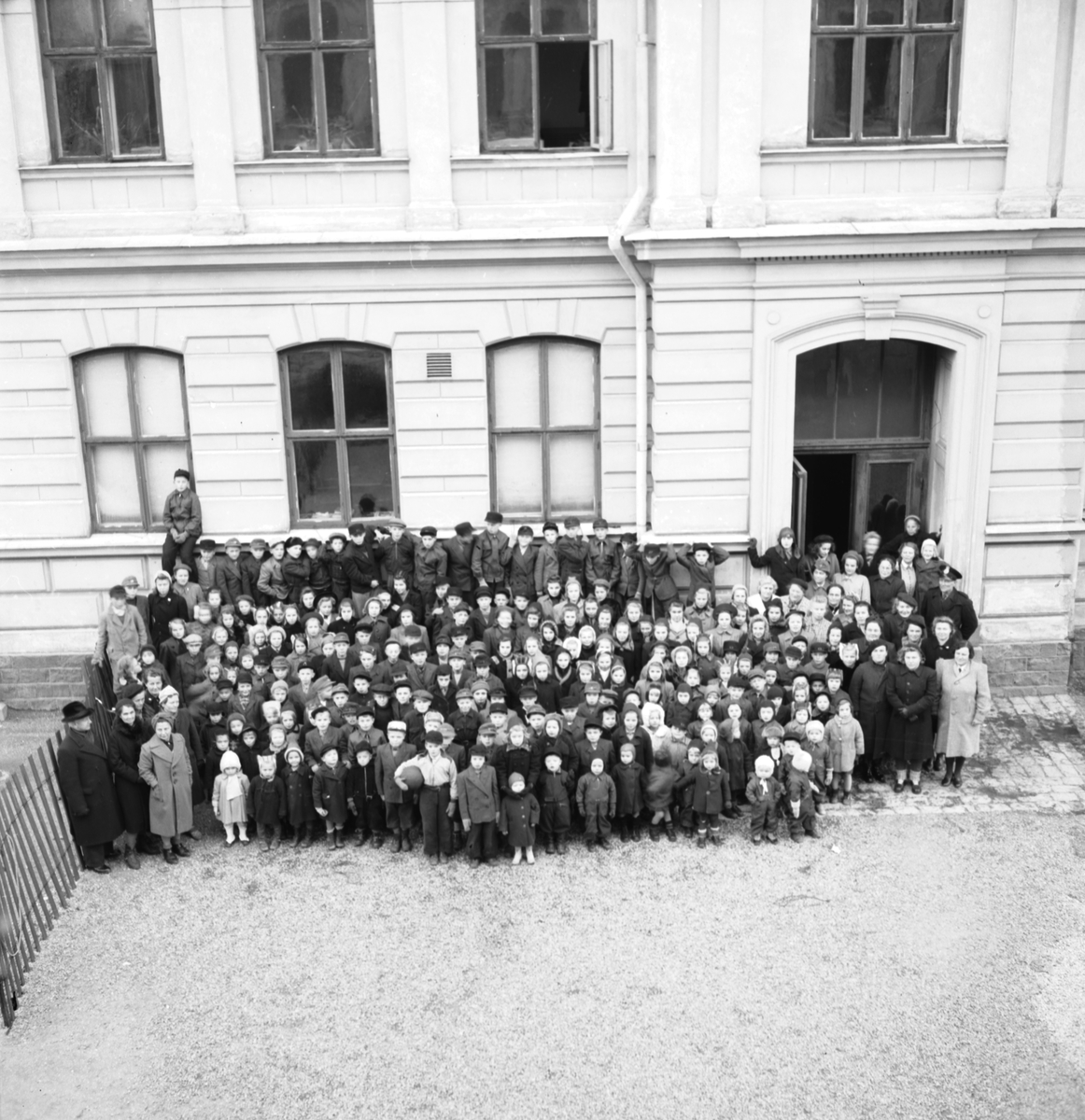 Ensamkommande finska flyktingbarn utanför Norra Skolans inkvartering/karantän i Gävle. Den 11 november 1944.