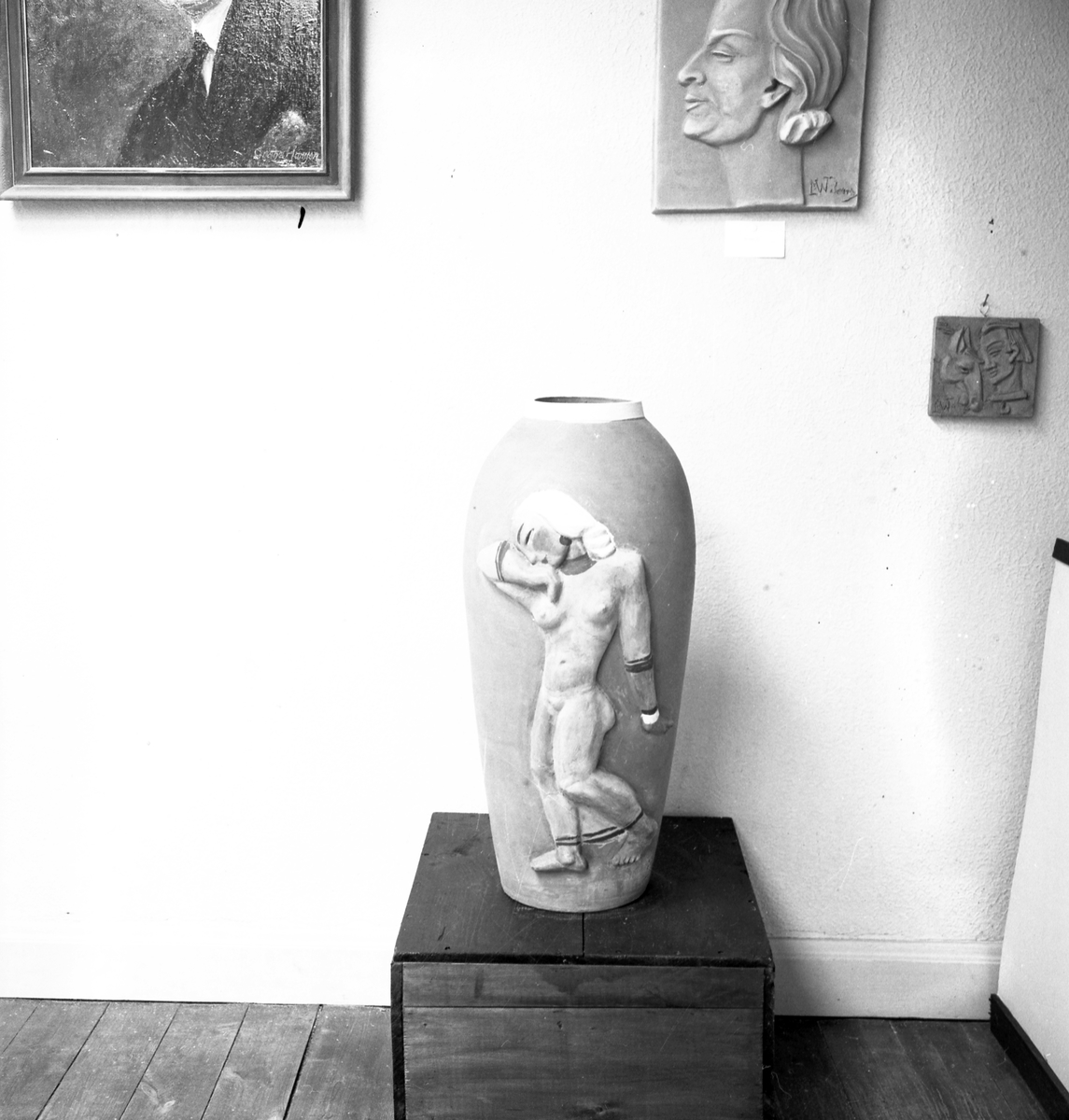 Golvvas av formgivare och skulptör Maggie Wibom på utställning i Konsthallen i Gävle i november 1936. Medutställare var målare Gretha Hansson.