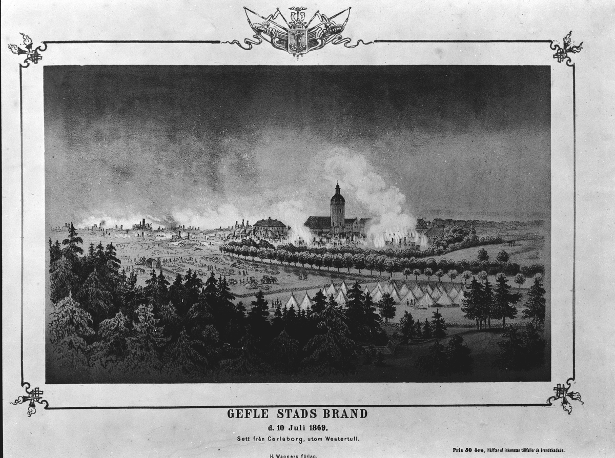 Titel: Vykort på "Gefle Stads Brand d. 10 juli 1869. Sett från Carlsborg, utom Westertull". Pris 30 öre