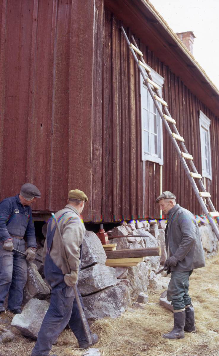 Tre män vid hembygdsgården Löka under pågående takomläggning och renovering.