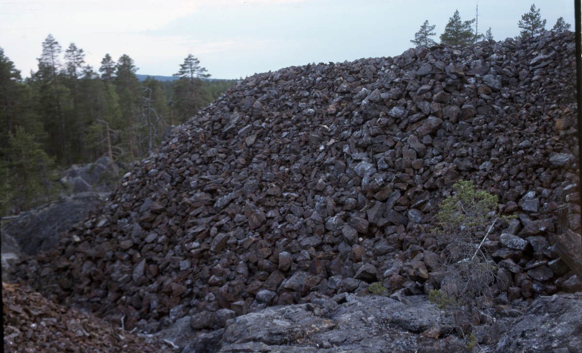 Flätsbo gruva. Stor hög av bruten sten. Skog i bakgrunden.