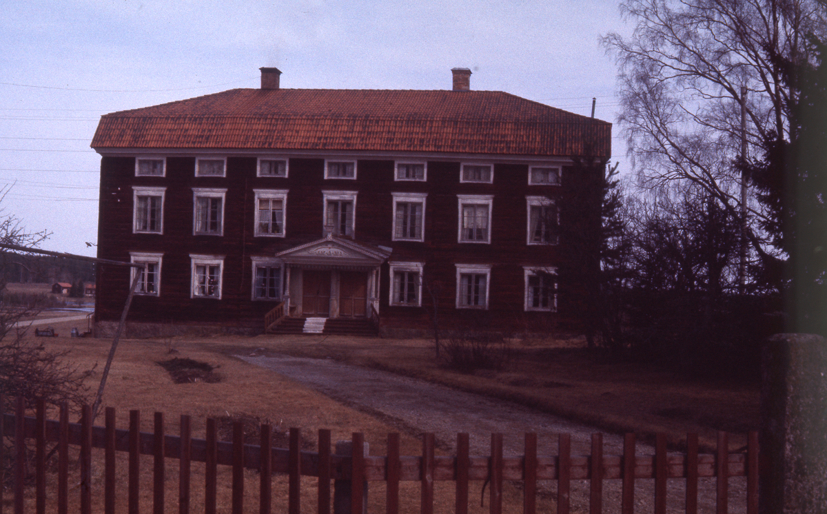 Jon-Lars. Stor rödmålad timmerbyggnad med vitmålade fönster och brutet tegeltak.