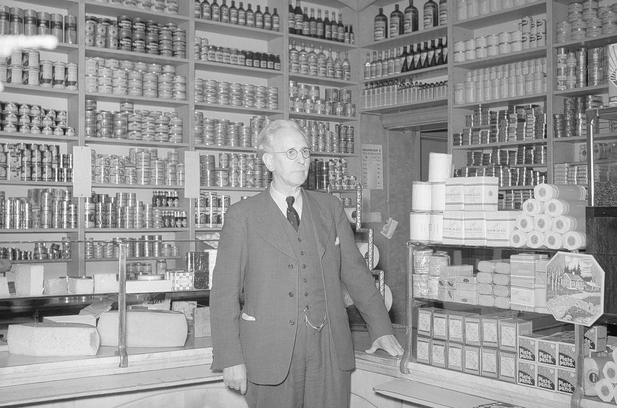 Lindblom Edv. i butiken. " Lindbloms Hörna". Började som torghandlare och 1922 öppnade han livsmedelsbutik.