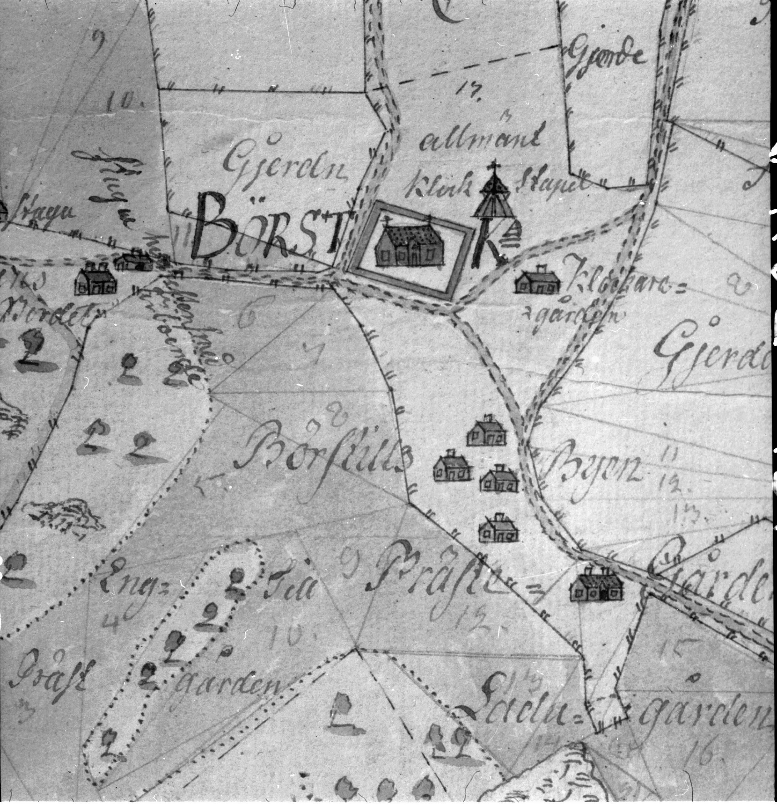 Karta över kyrkans placering med omgivning. Avfotograferad.