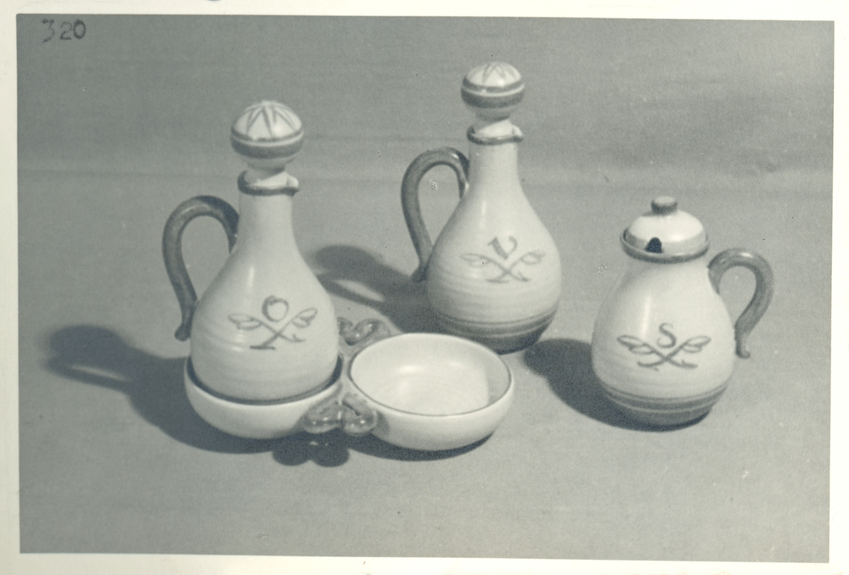 Två krus med tillhörande skål samt en senapsburk från Bo Fajans, formgivare Eva Jancke-Björk, 1900-talets mitt.