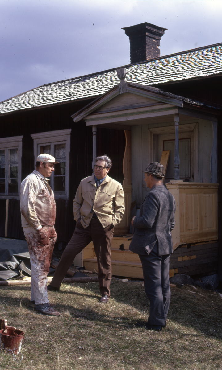 Tre män vid hembygdsgården Löka under pågående takomläggning och renovering.