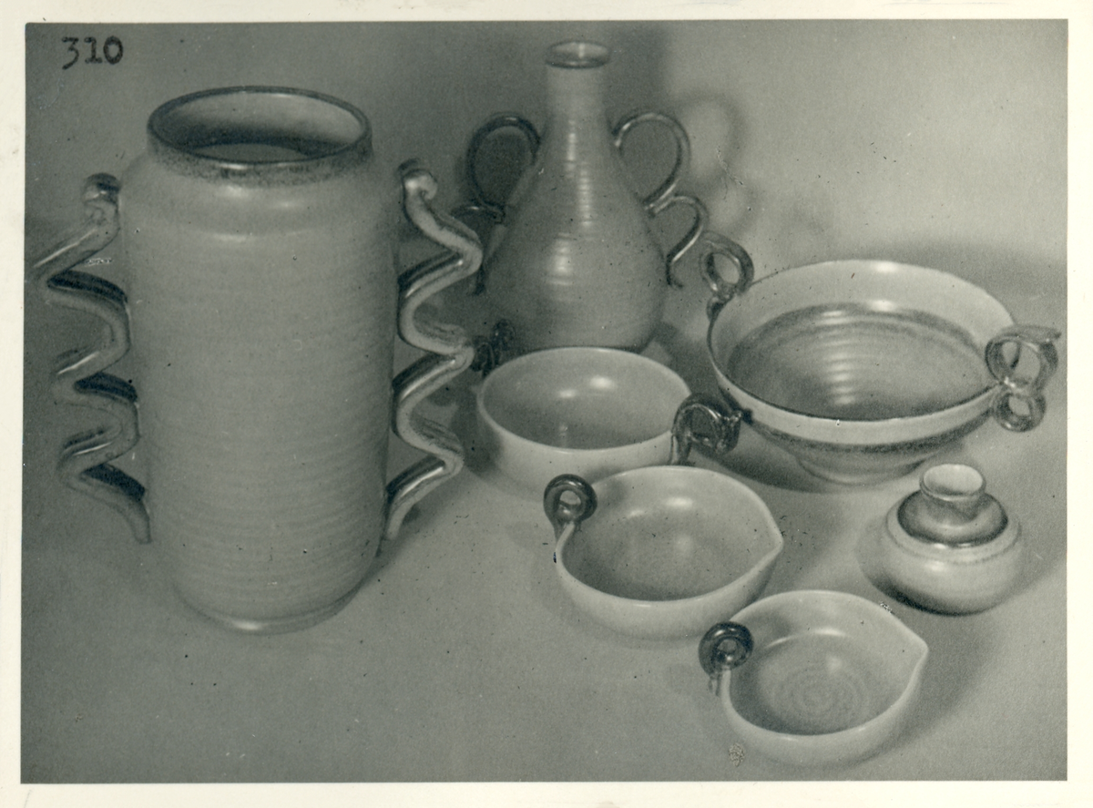 Vaser, skålar och ljusstake/vas från Bo Fajans, formgivare Eva Jancke-Björk, 1900-talets mitt.