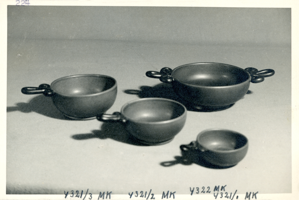 Skålar med handtag från Bo Fajans, formgivare Eva Jancke-Björk, 1900-talets mitt.