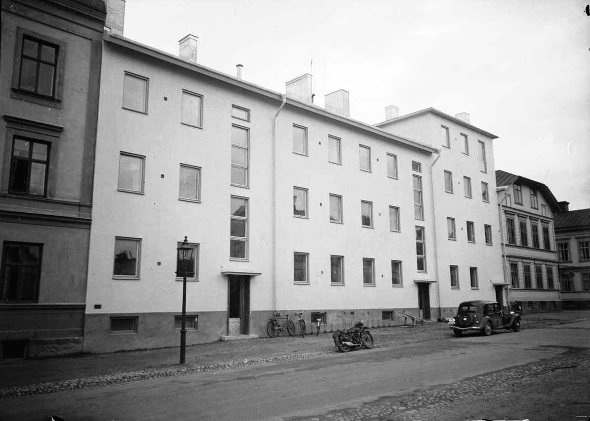 Bostadshus på Kaserngatan 58 i kv Reval. Tvärgatan till höger är Södra Kopparslagargatan. November 1939.
