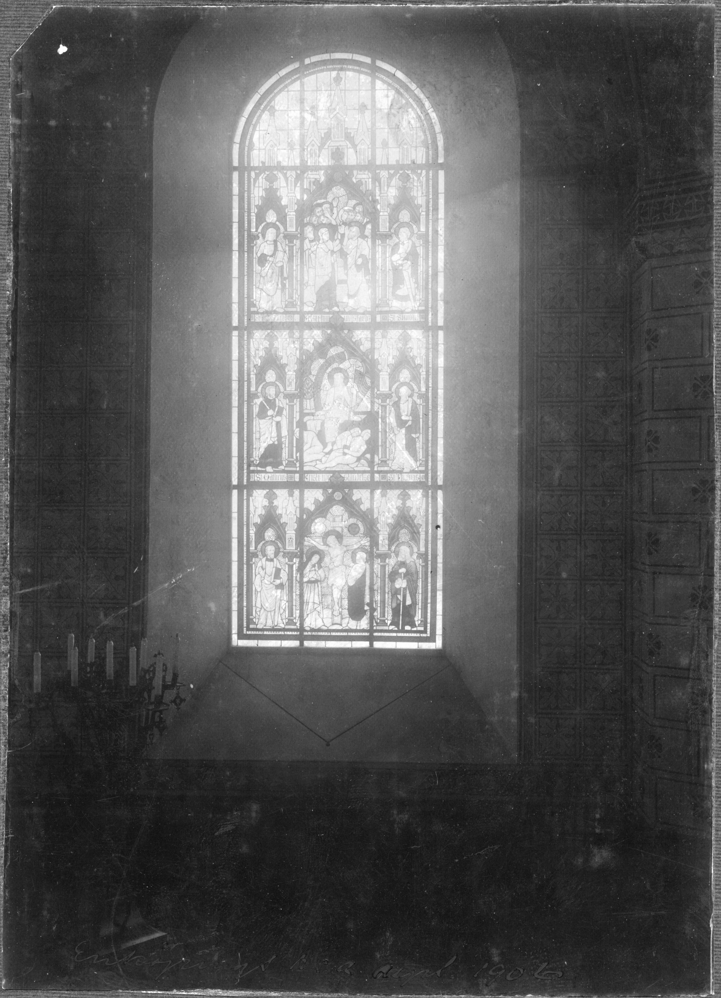 Korfönster, mot sydöst: Korsfästelsen, Uppståndelsen och Kristi HImmelsfärd. Carl Wilhelm Pettersson, 1906.