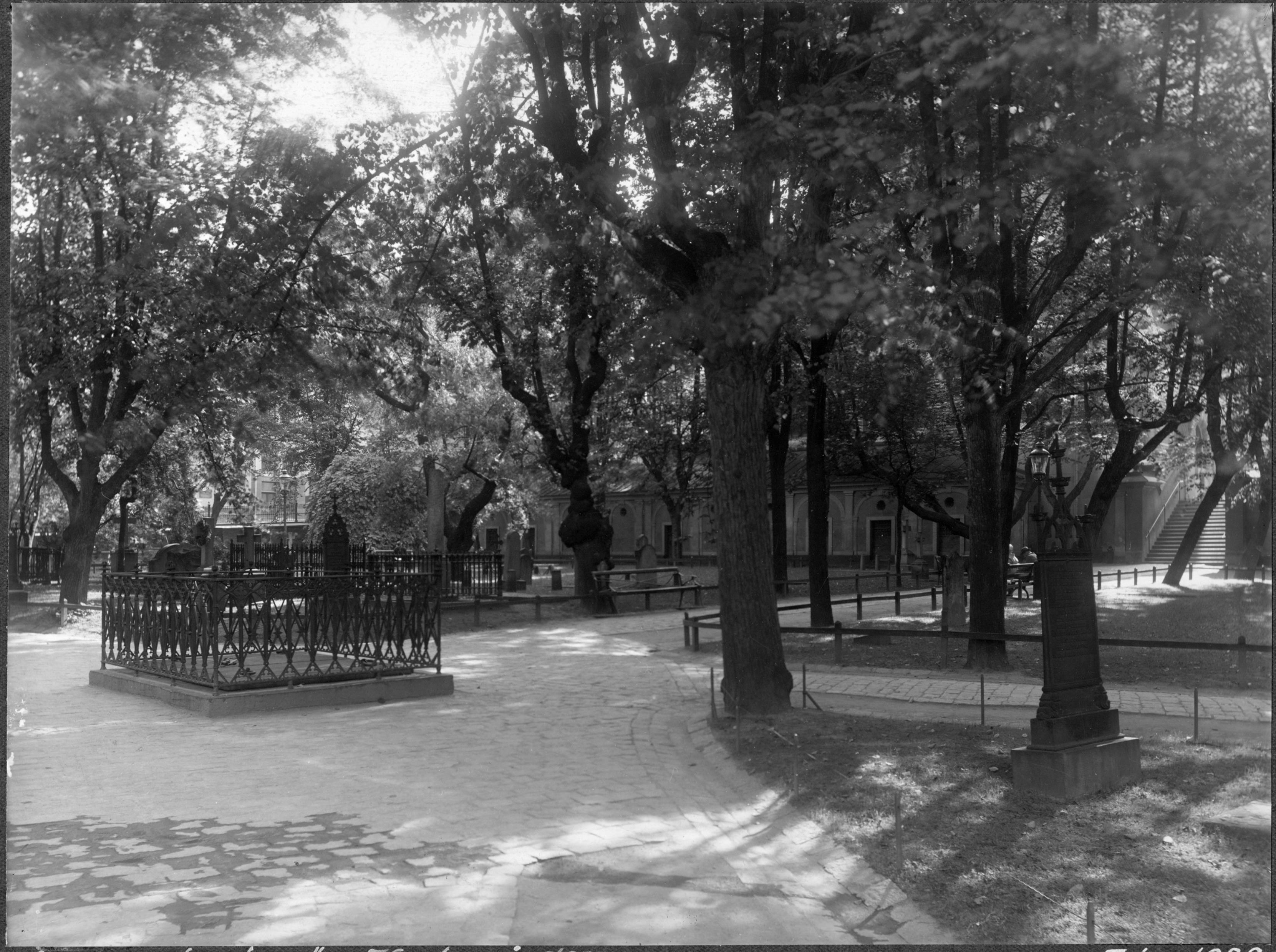 Kyrkogården med gravkoren utefter södra sidan i bakgrunden.