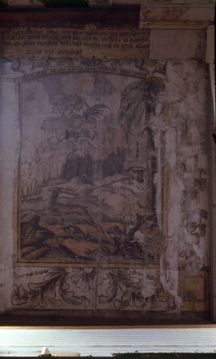 Väggmålning föreställande en jaktscen och med ett bibelscitat i överkant.