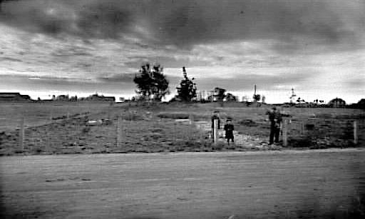 TVÅ BARN OCH VUXNA STÅR VID EN VÄG.