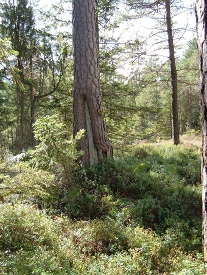 Foto av tjärtall. Spår efter sk tjäruväckeri, där levande tallar skattades på tjärved.