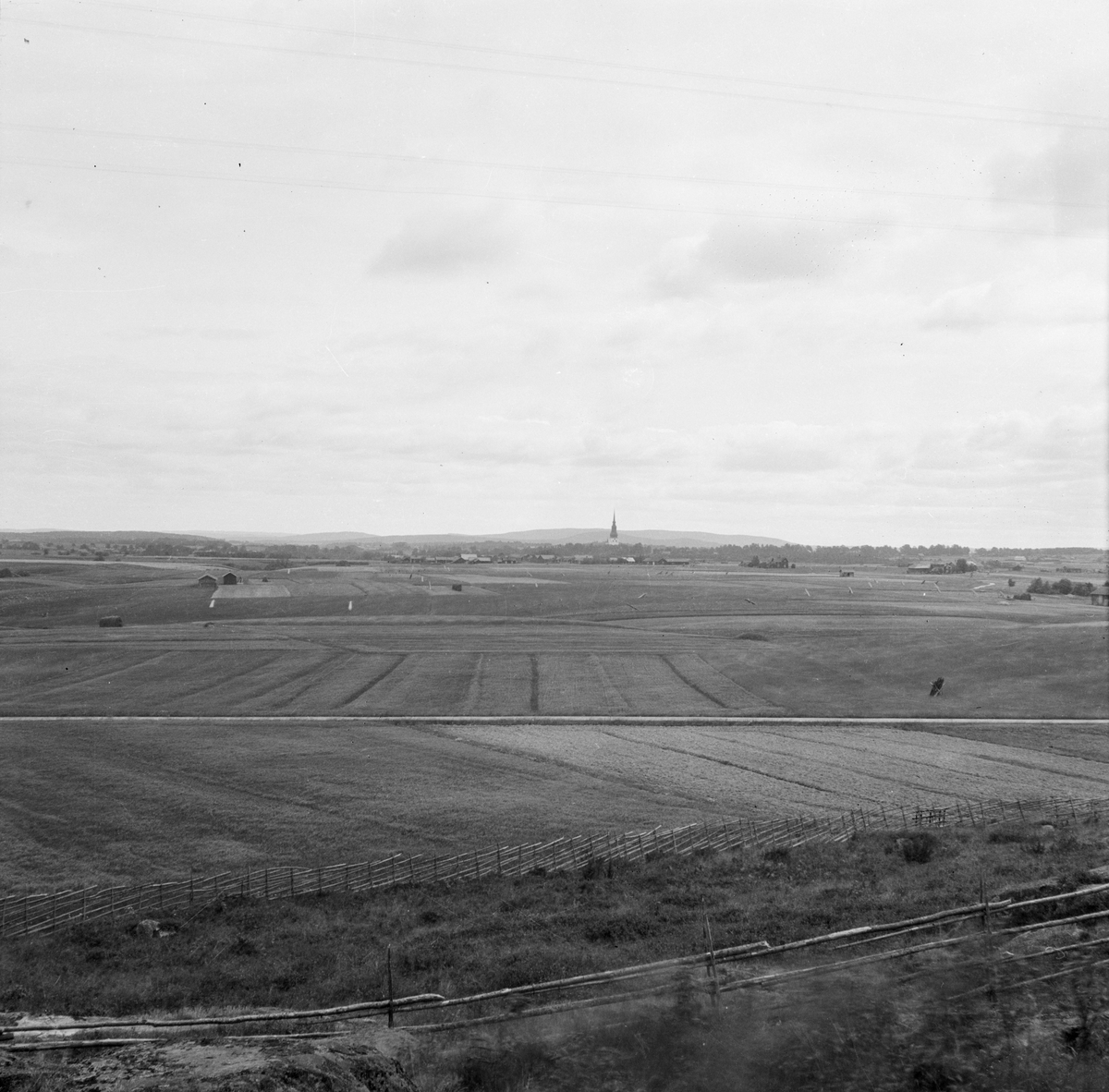Borlänge, Stora Tuna. Tunaslätten och kyrkan från Sörberget.