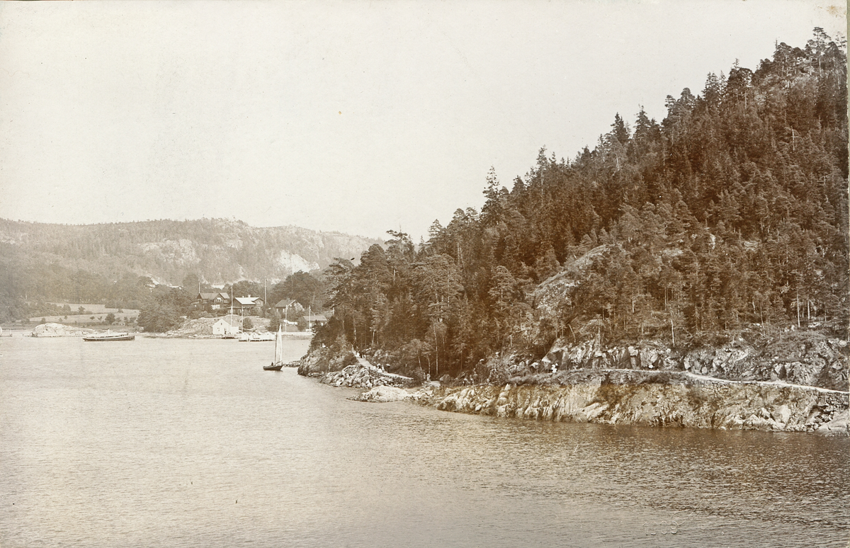 Titel: Parti av strandpromenaden Gustafsberg. Stämplad i vänstra hörnet: Maria Lundbäck Uddevalla. 1909.