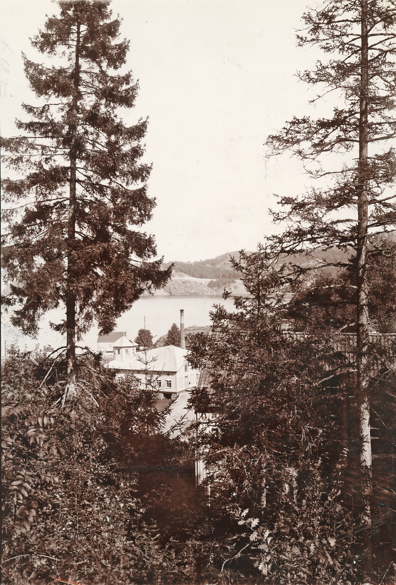 Parti av Gustafsberg. Varmbadhuset skymtar mellan träden.