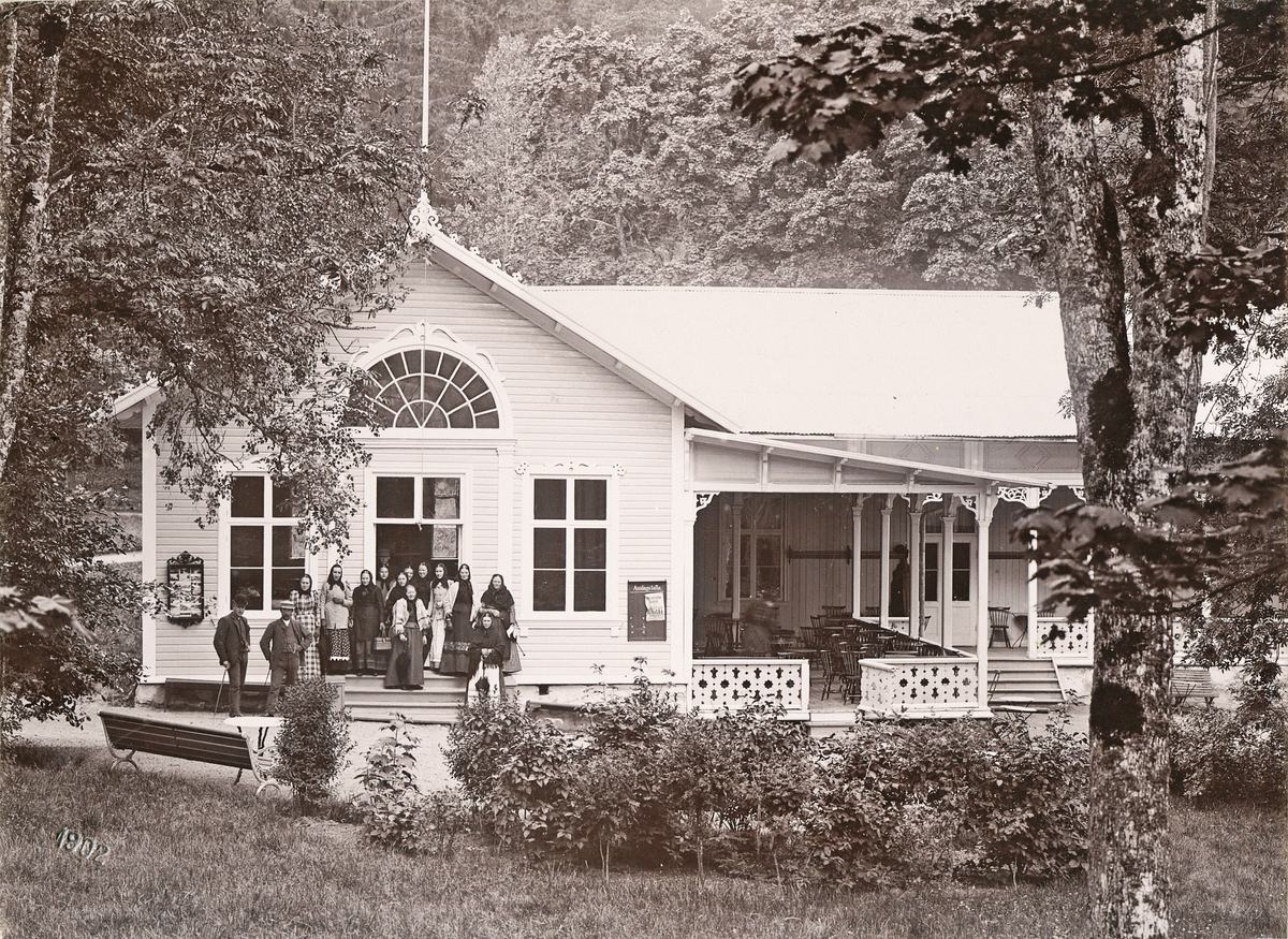 Gustafsbergs restaurang. En grupp kvinnor och män står på trappen framför byggnaden.