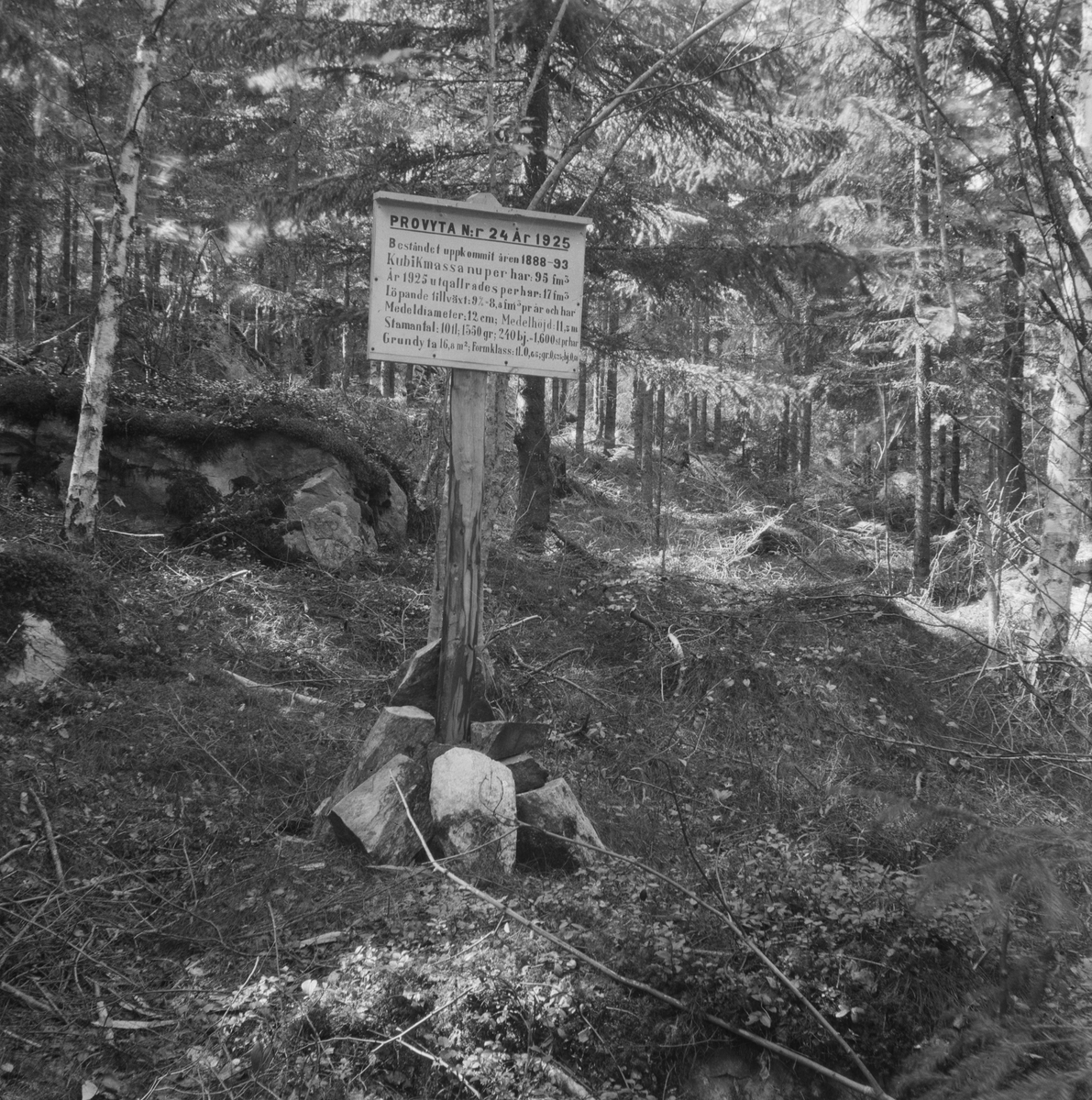 Provyta nr 24 år 1925, på hur mycket/snabbt träden växer. Dessa uppkom under 1888-1893, vilka senare gallrades år 1925 (står på skylten)
