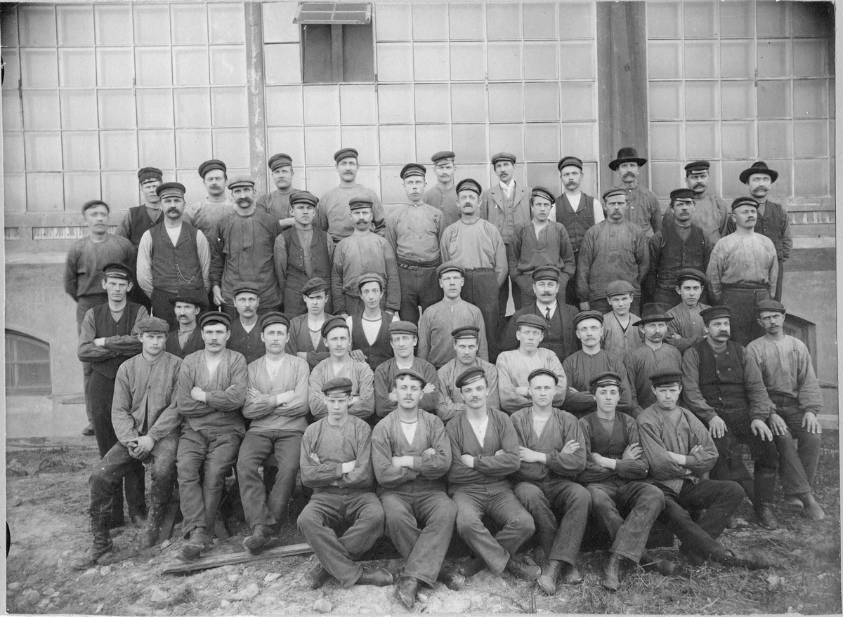 Ett arbetslag vid Kvarnsvedens pappersbruk, okänt årtal. Mannen i bakre raden med krage, slips och sportmössa är ingenjör Lindell.