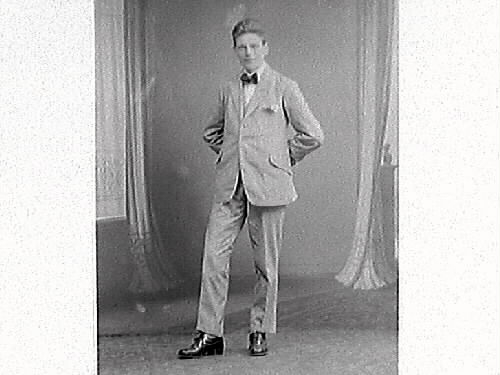 Evert Bengtsson i ljus kostym. Mansporträtt i helfigur och halvfigur.