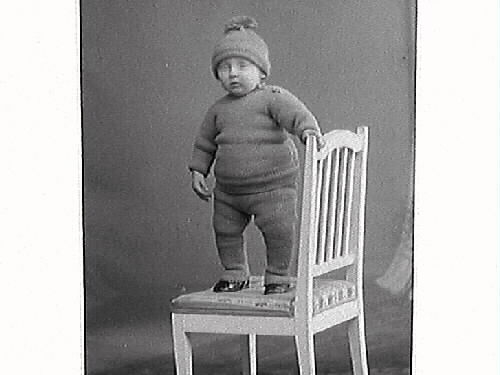Liten pojke på två bilder i olika kläder med en stol. Gustaf Antonsson Södergatan 16, Varberg beställde bilderna och är troligen barnets far.