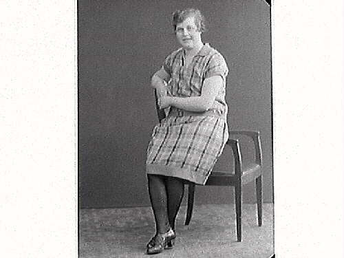 Kvinnoporträtt. Lilly Bengtsson, Gamla Köpstad. På bilden i helfigur är hon iförd rutig klänning och bröstbilden en kappa med brosch på pälskragen.